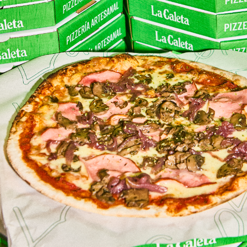 Jamón, champiñones al ajillo, cebolla caramelizada al malbec, mozzarella.